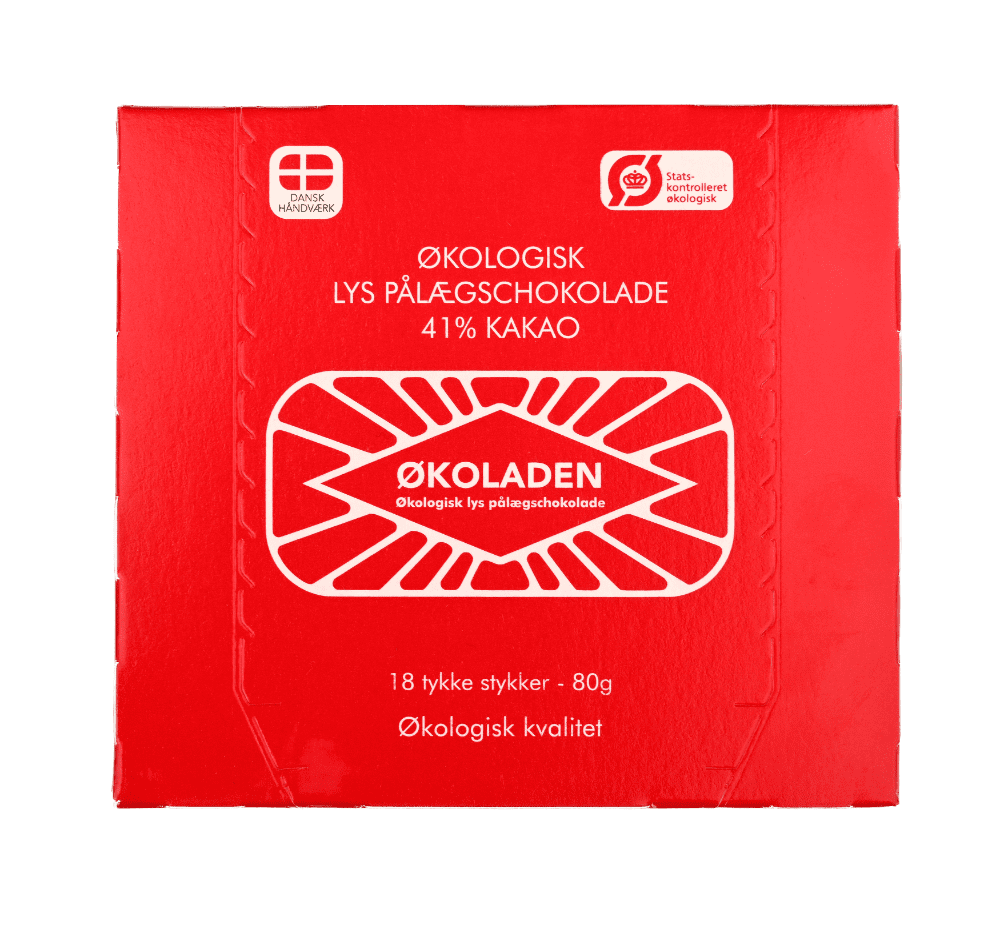 18 tykke skiver lys økologisk pålægschokolade med 41% kakao.