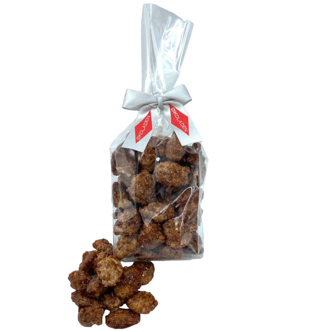Pose med 90g brændte mandler. Mandlerne har en god balance mellem sukker og mandel, hvilket gør at smagen af mandel kommer godt igennem.