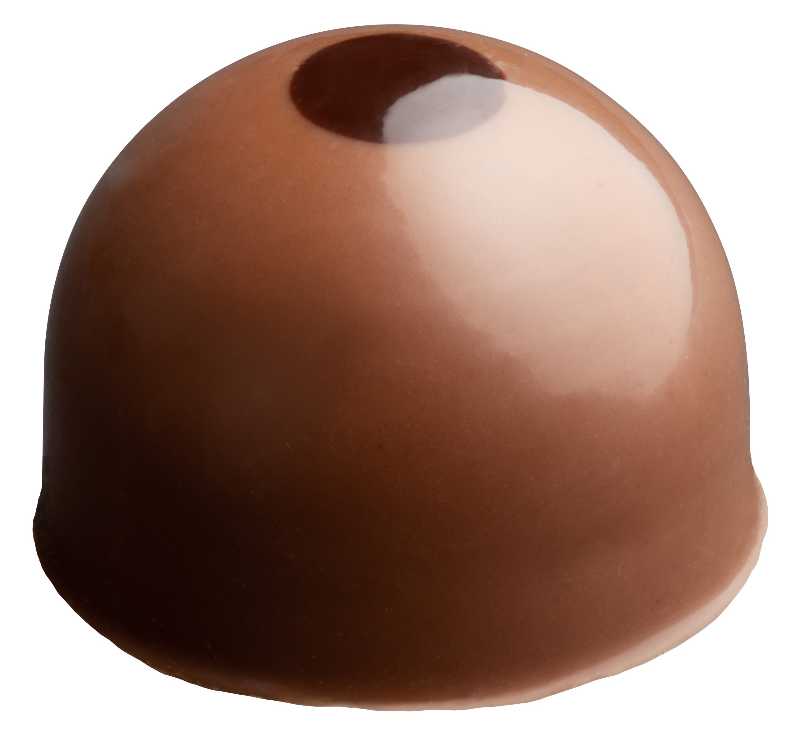 Æske med 25 stk. fyldt chokolade tiltænkt til salg enkeltvis. Denne variant er med kaffe i en skal af 40% mælkechokolade med en plet af 72% mørk chokolade.