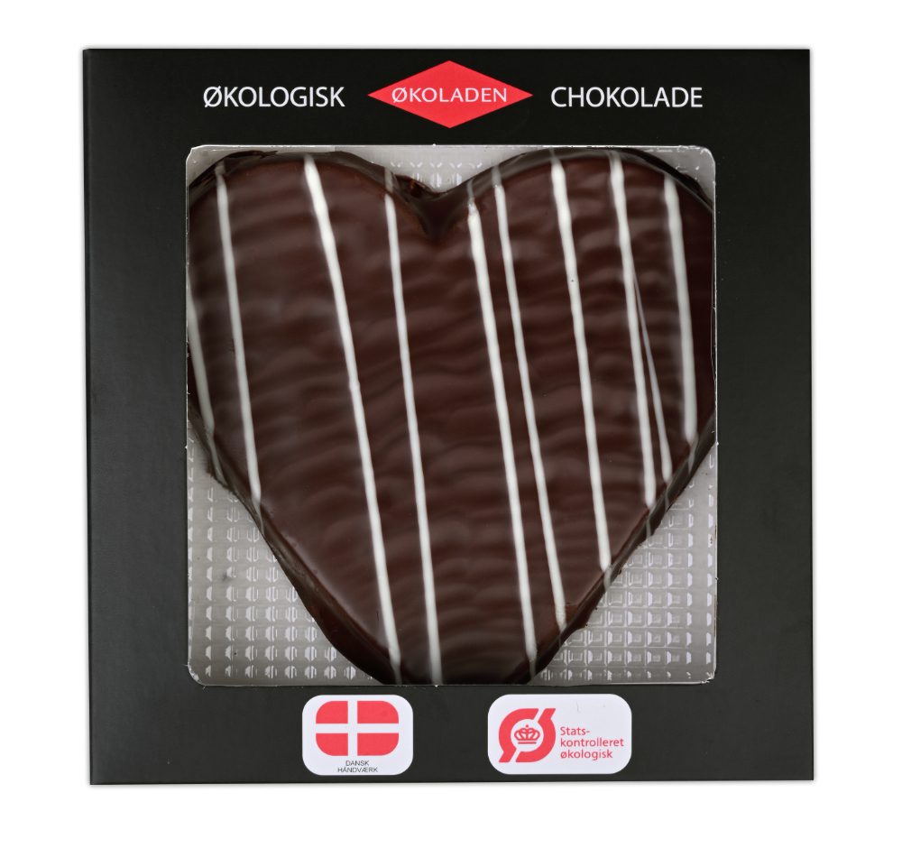 Økologisk marcipanhjerte overtrukket med 72% mørk chokolade og pyntet med striber af hvid chokolade