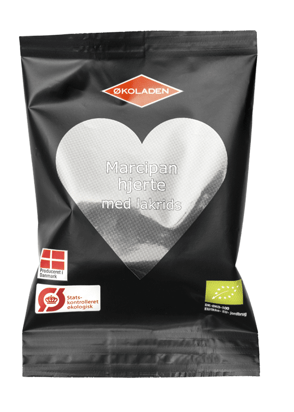 Marcipanhjerte med smag af lakrids. Den økologiske råmarcipan bliver blandet med knust rålakrids og lakridslikør for at sikre en kraftig smag af lakrids gennem hele stykket. Herefter bliver lakridsmarcipanhjertet formet og overtrukket med hvid chokolade. Til sidst hånddekoreres marcipanhjertet med rålakrids.