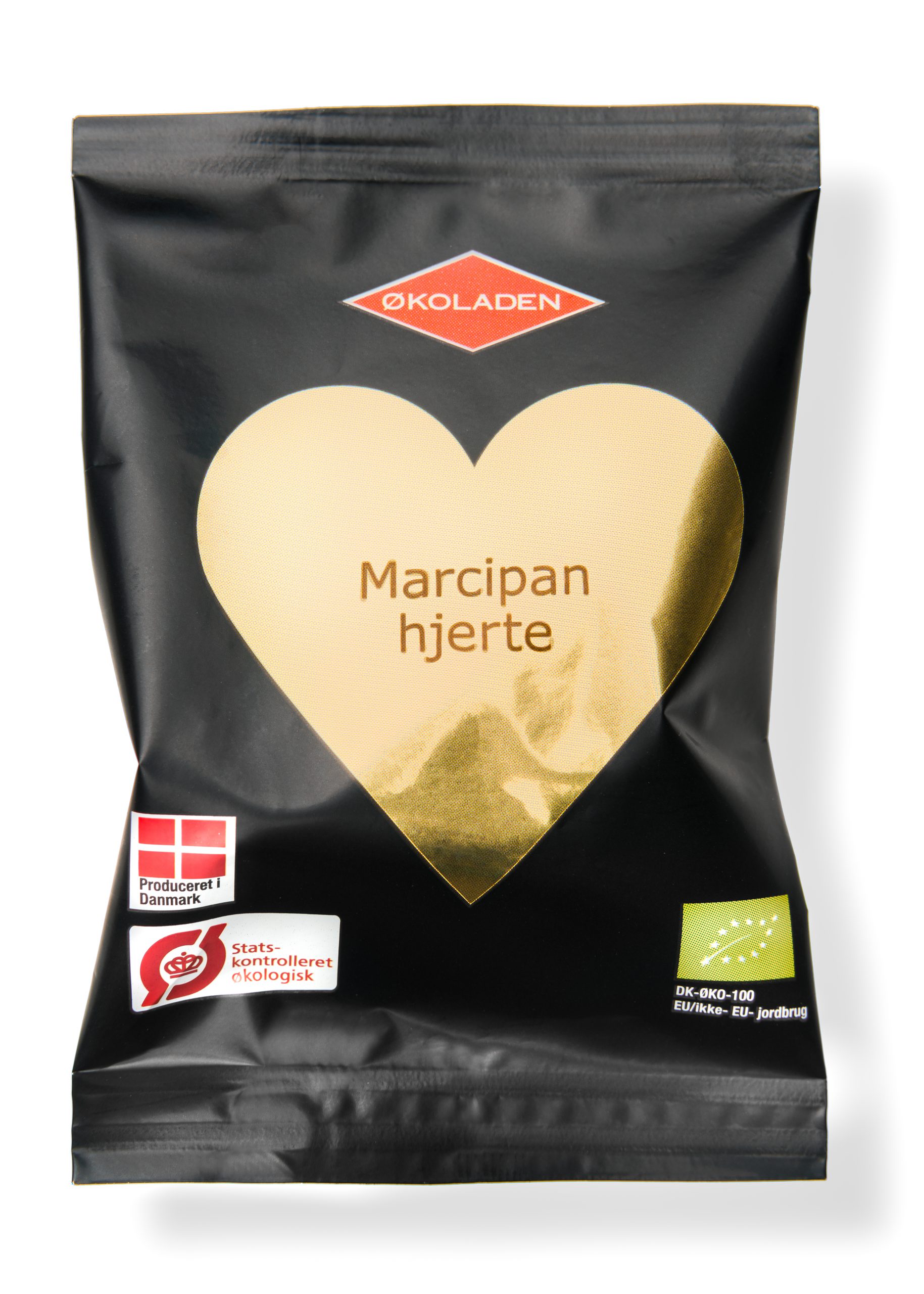 Marcipanhjerte med 72% økologisk mørk chokolade hånddekoret med en streg af hvid chokolade. Den økologiske marcipanen er lavet af nogle af verdens bedste økologiske mandler, som primært er fra Valencia i Spanien. Mandlerne er valset ekstra fint, hvilket gør marcipanen blød, smidig og uimodståelig lækker og den perfekte kombination til den kraftige og intense mørke chokolade.