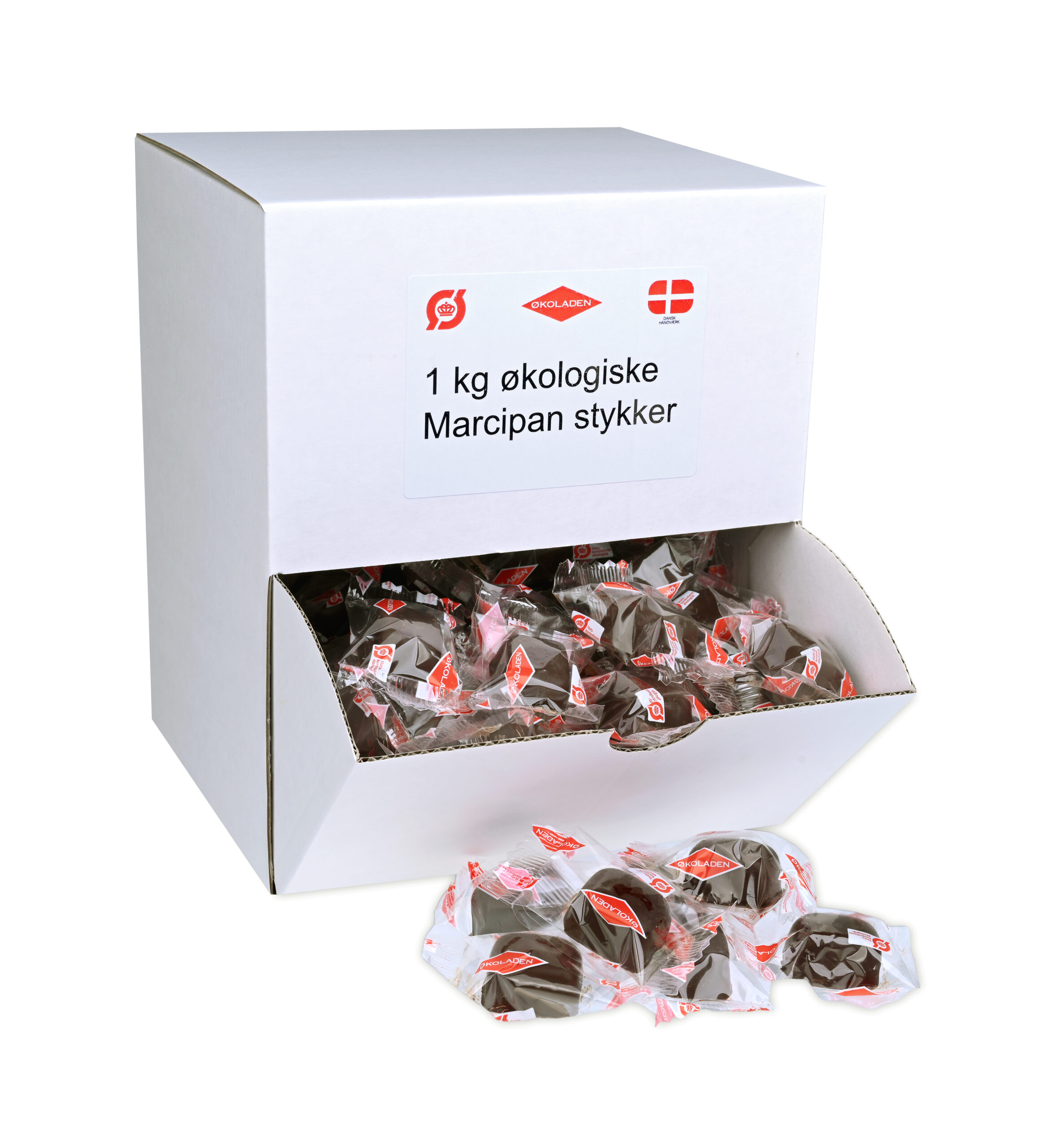 Økologiske marcipanstykker a’ 9 gram overtrukket med 72% økologisk mørk chokolade af høj kvalitet, som er flowpakket.